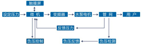 调节水泵的转速来保持管网压力恒定,在系统出水管路处检侧到的压力小于水泵的启动压力值时,能够自动调节水泵转速使出口压力恒定。水泵达到工频转速运行但压力达不到设定压力时,系统按{颐序启动P2, P3水泵;随粉用水量的减少,出口压力上升,水泵的转速逐渐降低,如果水泵转速降zhi系统设里的zui月氏转速,系统按P3, P2, P1停止水泵运行。