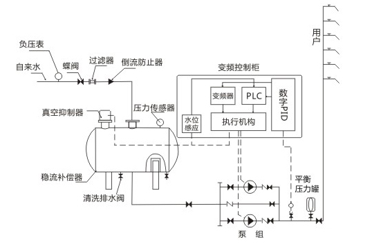 1、与自来水管网直接相连,不用建水池(箱),并不形晌其它用户水压。